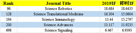 Science系列的杂志比Nature,Cell系列杂志数量少一些,分数跟Cell系列相近。除了Science Signaling 低于10分外,其他杂志均是10分以上。Science Immunology将会涨到超过15分。