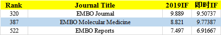 EMBO杂志的分数大概9分多,几个杂志的分数基本稳定, EMBO Molecular Medicine 2020年应该会涨到10分。以前10分的杂志很少,所以EMBO杂志比较有影响力,而现在10分以上杂志越来越多,它的名气不如以前。