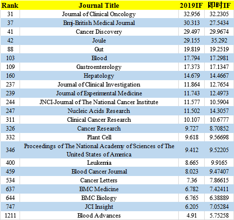 除了系列杂志外,还有很多有名气的期刊,有的只是单一的期刊,有的是系列期刊里的旗舰期刊。Cancer Discovery 是AACR的旗舰期刊,2019年29.497,2020年将会突破30分。AACR下面的Clinical Cancer Research和Cancer Research的名气也不小。Clinical Cancer Research近年来在10分左右浮动,2020年会接近11分。