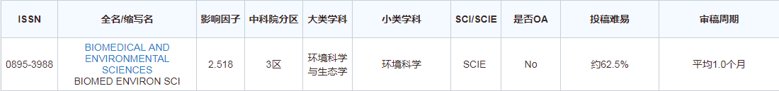 3.医学sci《生物医学与环境科学》 英文名:Biomedical And Environmental Science