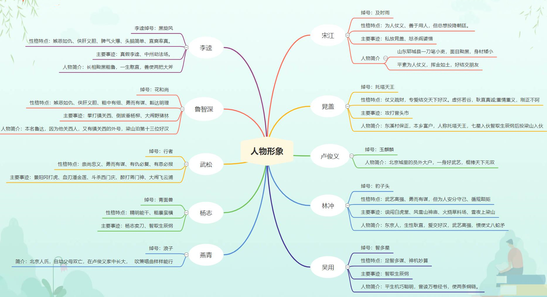即使你没读过原著也应该看过电视剧,即使没看过电视剧肯定也听过好汉歌,要是好汉歌也没听过那武松打虎的故事也一定会知道。整个小说故事情节曲折,语言生动,具有高度的艺术成就。下面就让我们用水浒传思维导图来赏析一下这本名著水浒传及这些梁山好汉的性格特点。文章源自:https://www.xuebayuan.com/学霸园-https://www.xuebayuan.com/siweidaotu/481.html
